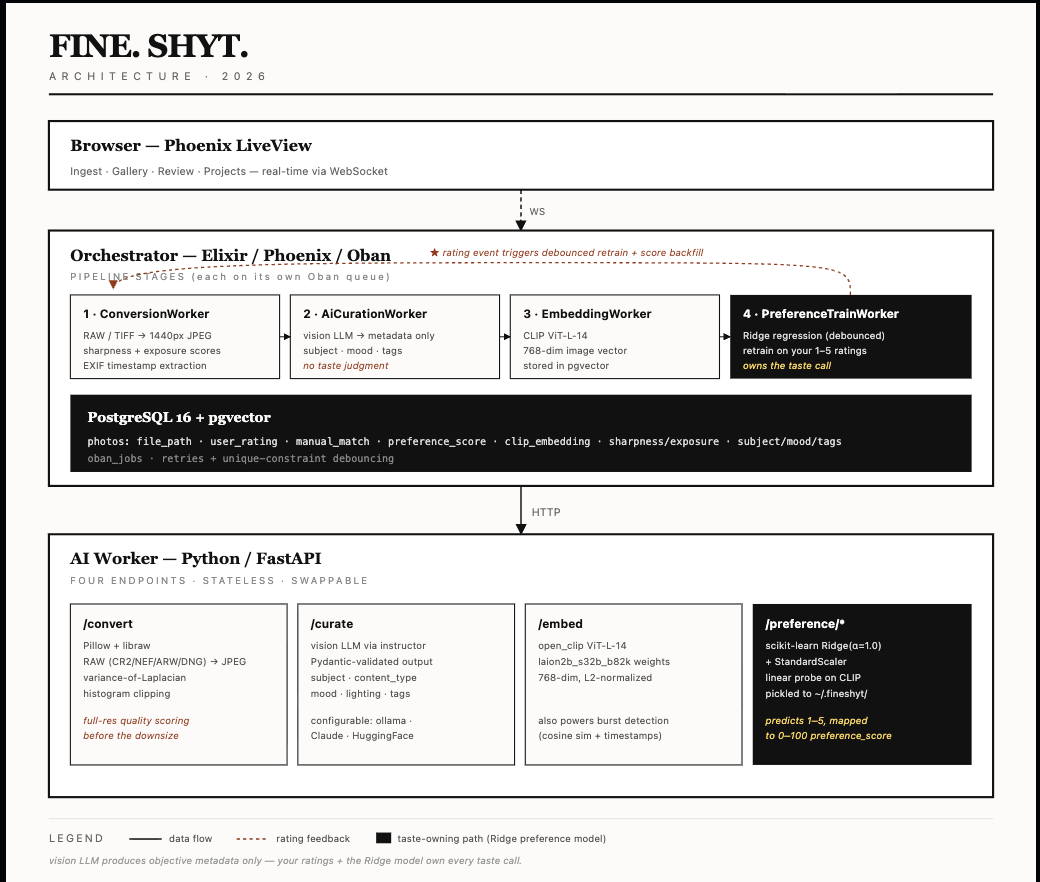 In a separate model pipeline, CLIP turns each photo into a vector. CLIP (ViT-L-14, a vision transformer trained on 2B image-text pairs) runs each photo through its image encoder and spits out a 768-dim L2-normalized embedding, a point in a semantic space where visually/conceptually similar photos land near each other. This is the feature extractor. CLIP was trained contrastively on 2B image-text pairs, so the geometry of this space already encodes "looks similar," "same subject," "same mood", all things that correlate with what you'd rate highly. Nothing about fine shyt yet. Not our fine shyt at least. That distinction also keeps the architecture honest. The worker can be pointed at different model providers through environment configuration โ local inference through Ollama, hosted APIs, or other compatible endpoints โ but the model choice changes the source of descriptive intelligence, not the source of authority. Local inference is appealing because it is private and effectively free after setup, though it turns image analysis into a very literal hardware problem: the fans spin, the queue grows, and "cheap" becomes a question of patience and thermals. Hosted models are easier to scale, but the core design stays the same either way: the model annotates; I decide.
